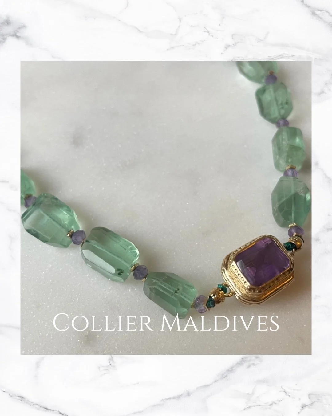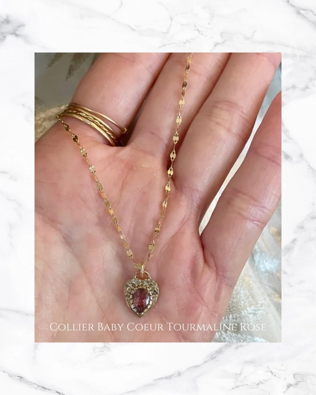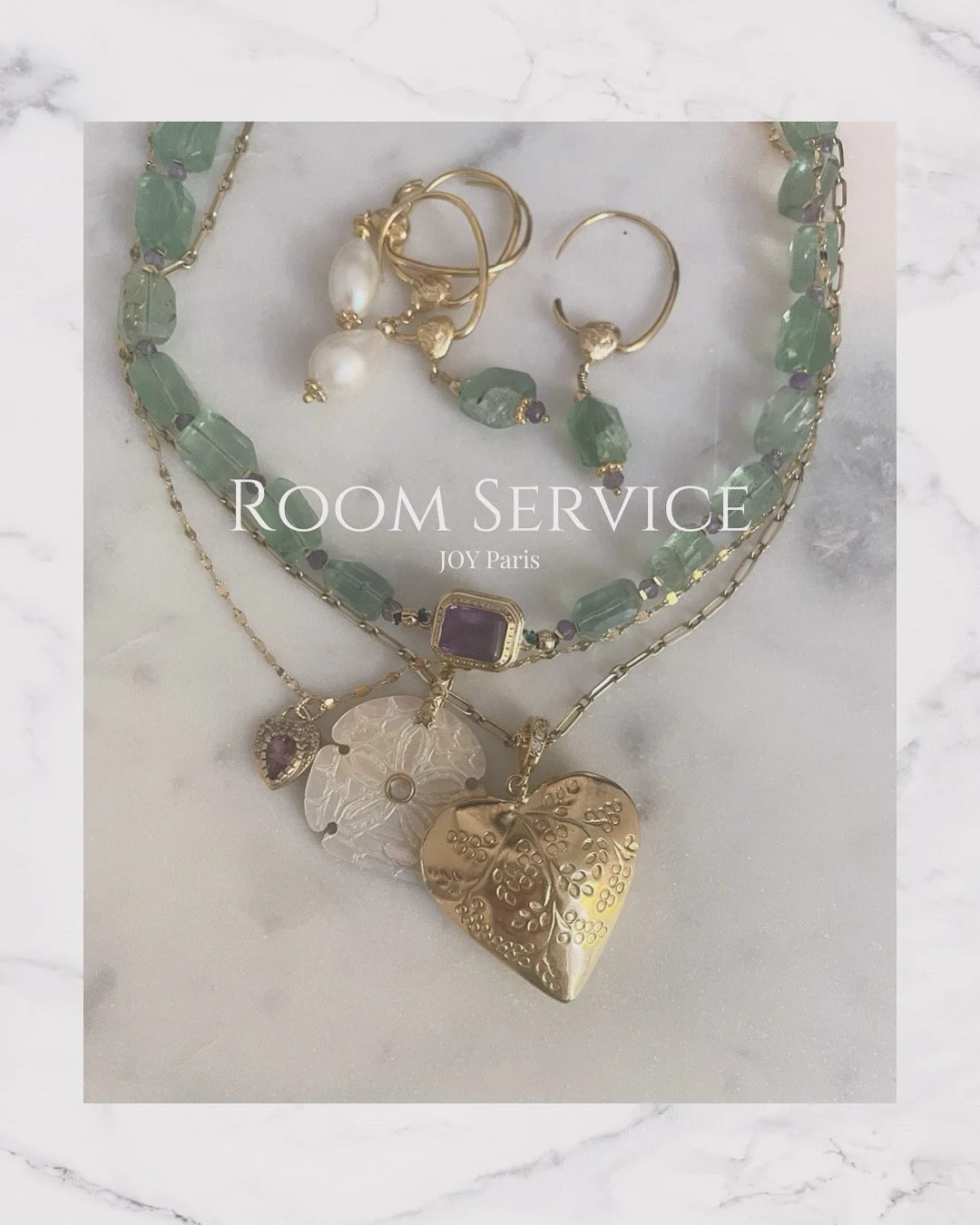 ROOM SERVICE JEWELRY, de haut en bas, boucles d’oreilles Annili Apatite Lagon, Annili Perle Naturelle, collier Maldives Apatite et Aethyste, collier Baby Coeur Tourmaline Rose Diamants et chaine Papillon, charms Sand Dollar Nacre Gravée et Gros Coeur Mimosa.