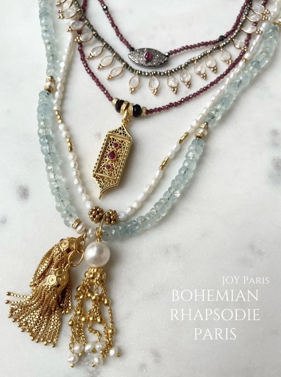 DE HAUT EN BAS, COLLIER AYIN DIAMANT ET GRENAT, COLLIER ROSALBA LABRADORITE, COLLIER DYONISOS GRENAT, LES SAUTOIRS ARÈS PERLES BLANCHES, ET ANDROMEDA AIGUE MARINE.